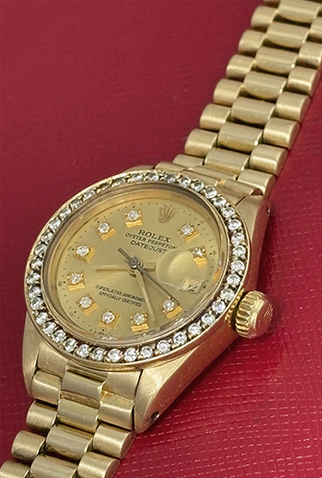 Case Material: 18k Yellow Gold case with custom 1.2 ct. Diamond bezel (26mm dia.)