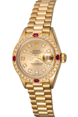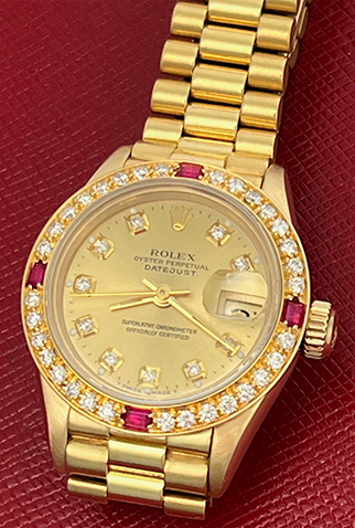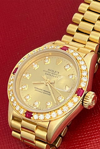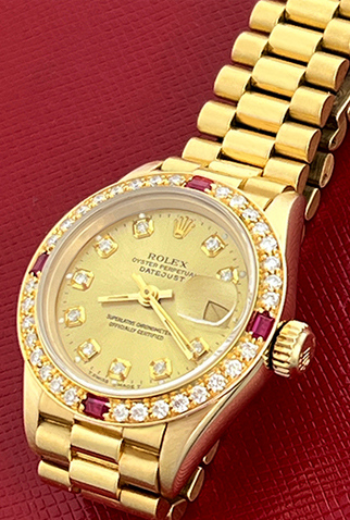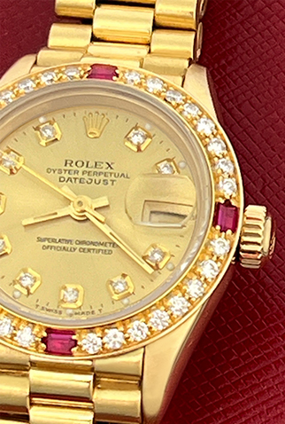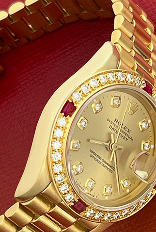 Case Material: 18k Yellow Gold case with custom Diamond and Ruby bezel (26mm dia.)