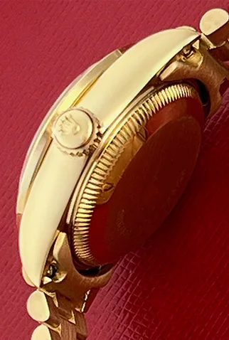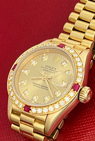 Case Material: 18k Yellow Gold case with Rolex Diamond and Ruby bezel (26mm dia.)