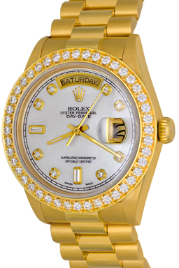 Case Material: 18k Yellow Gold case with custom 1.6 ct. Diamond bezel (36mm dia.)