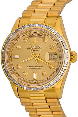 Case Material: 18k Yellow Gold case with custom 2.5 ct. baguette Diamond bezel (36mm dia.)