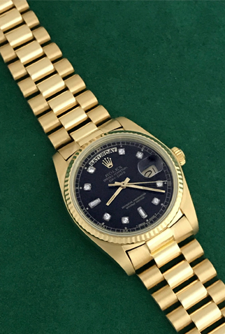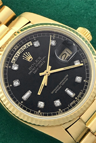 Dial: Black Dial with custom round & baguette Diamond hour markers