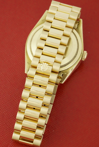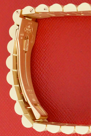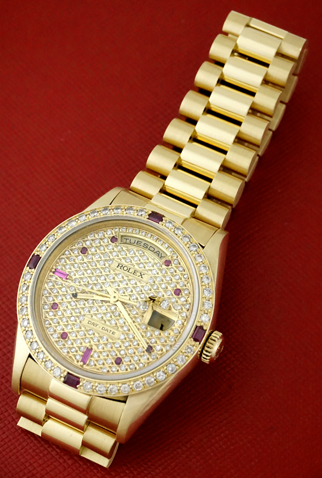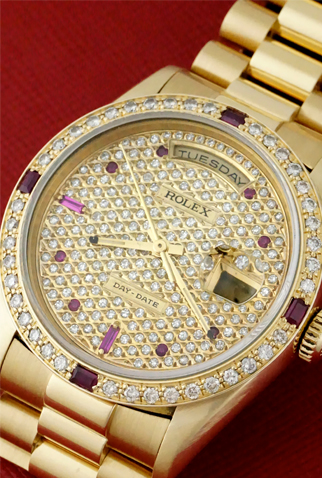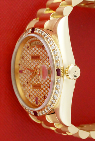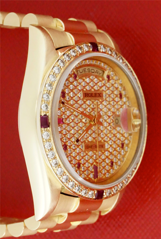 Case Material: 18k Yellow Gold case with custom Ruby & Diamond bezel (36mm dia.)