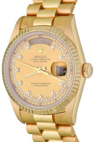 Dial: Champagne Rolex “String” Diamond dial with Diamond hour markers and string of Diamonds around edge of dial