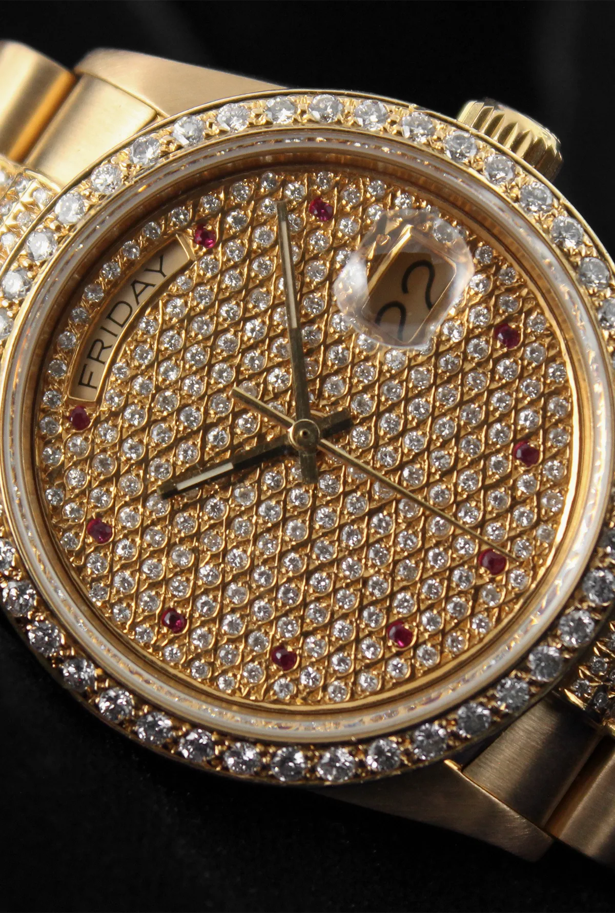 Dial: Custom Diamond Full Pave Dial with Ruby hour makers