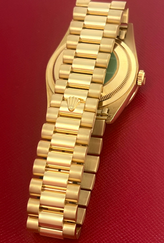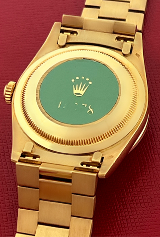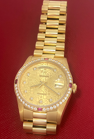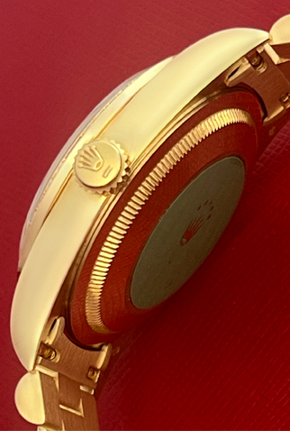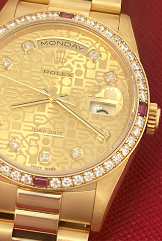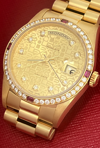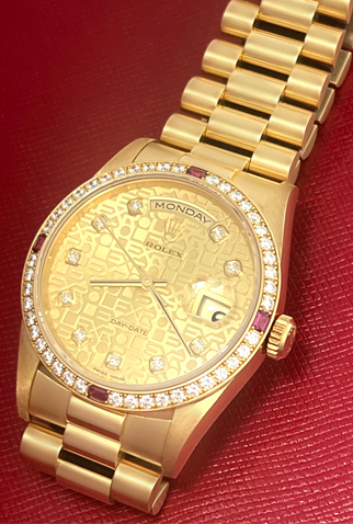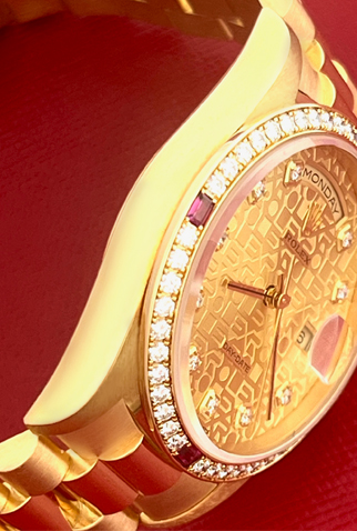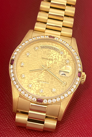Case Material: 18k Yellow Gold case with Rolex Diamond and Ruby bezel (36mm dia.)