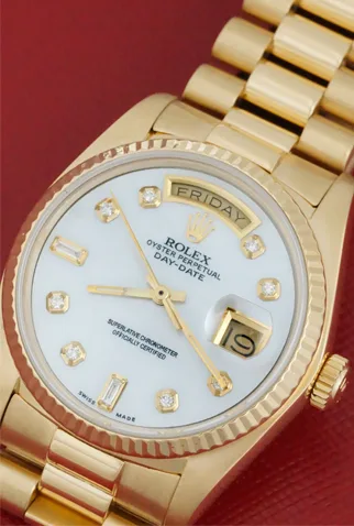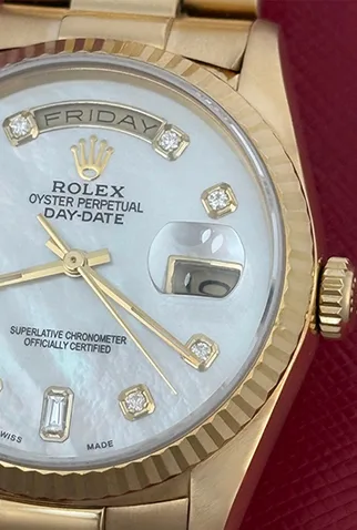 Dial: Custom Mother of Pearl dial with custom round and baguette Diamond hour markers