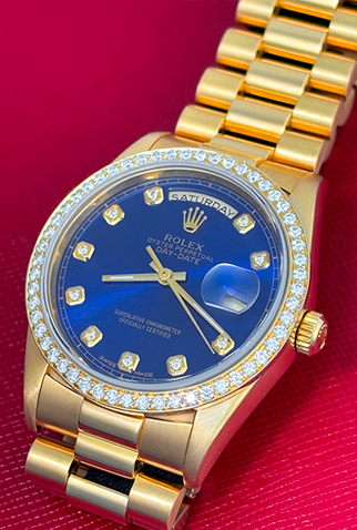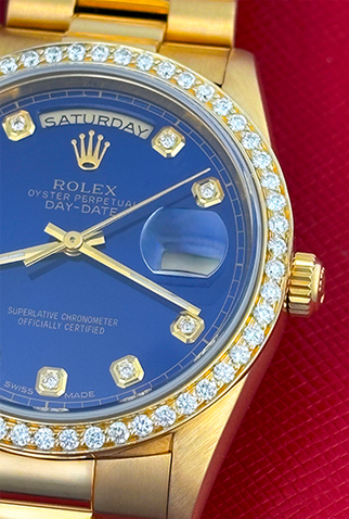 Case Material: 18k Yellow Gold case with custom Diamond bezel (36mm dia.)