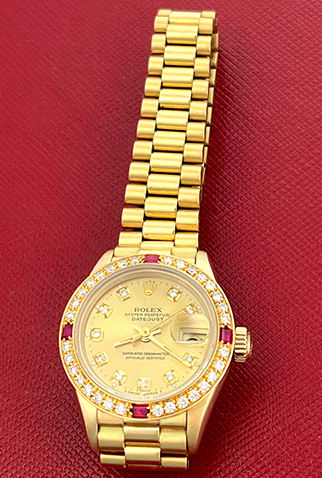 Case Material: 18k Yellow Gold case with custom Diamond and Ruby bezel (26mm dia.)