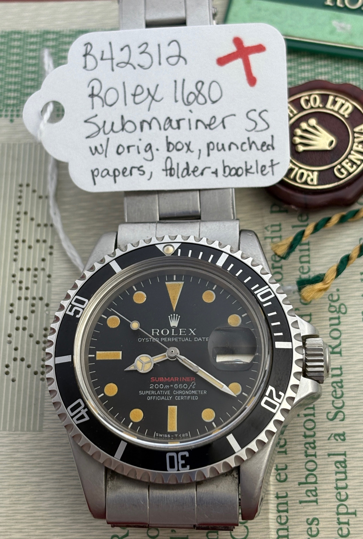 Additional Information: Original Rolex box, punched papers, green plastic Rolex folder, Submariner booklet, Anchor Keychain and Rolex instruction booklet with punched serial number inside booklet