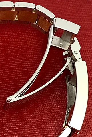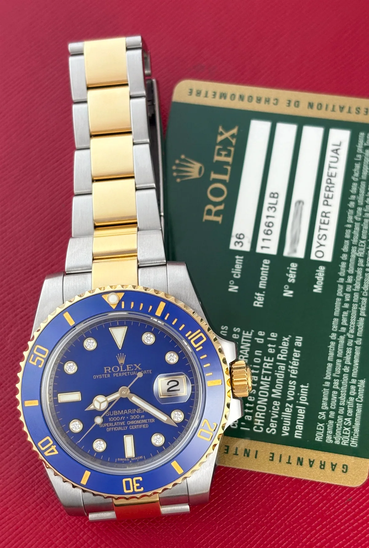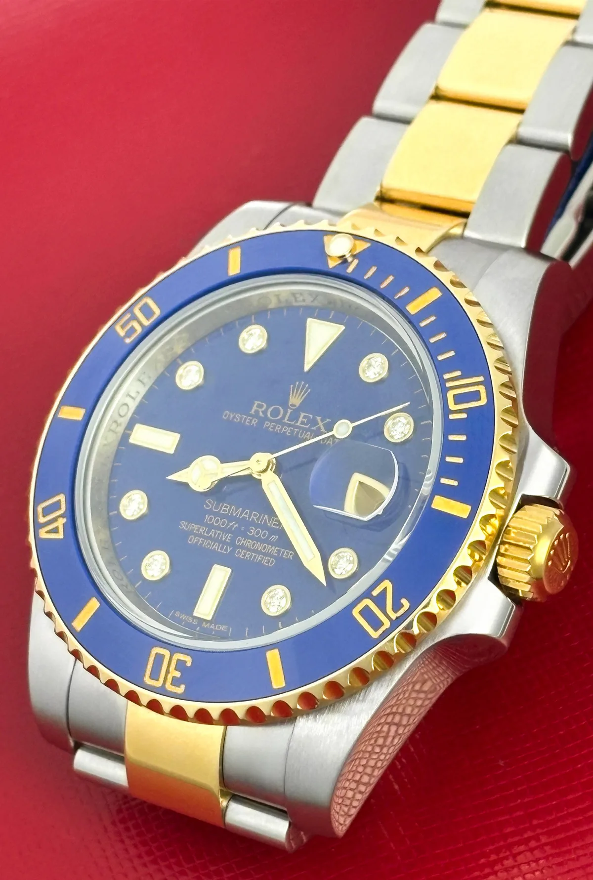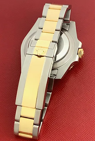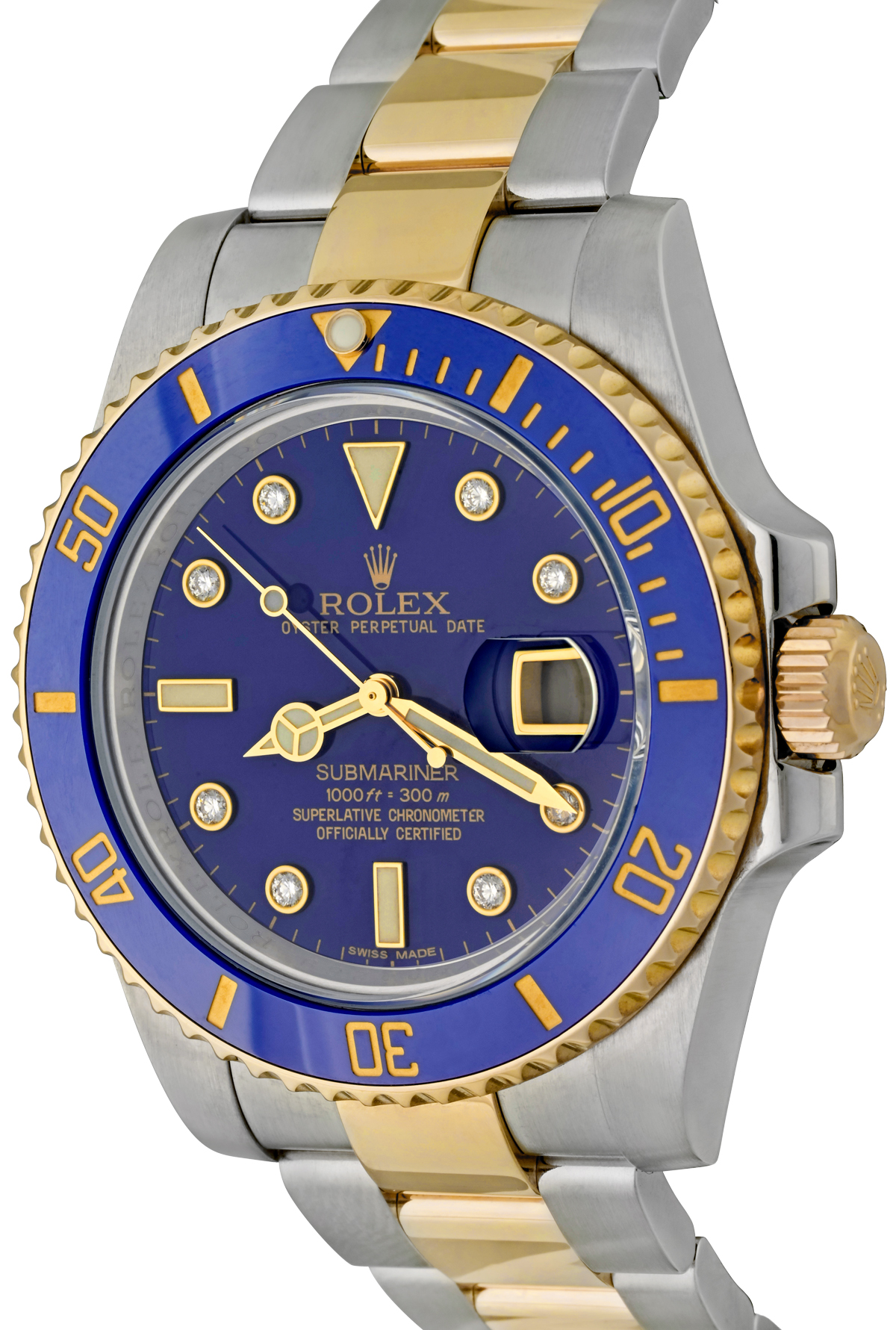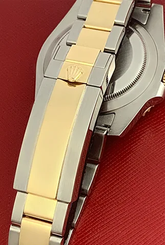 Case Material: Stainless Steel case with 18k Yellow Gold bezel with Blue ceramic insert (40mm dia.)