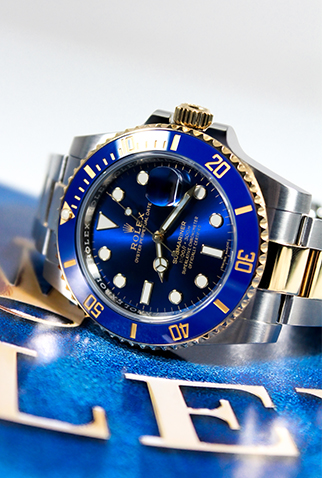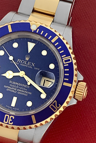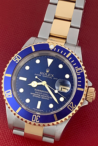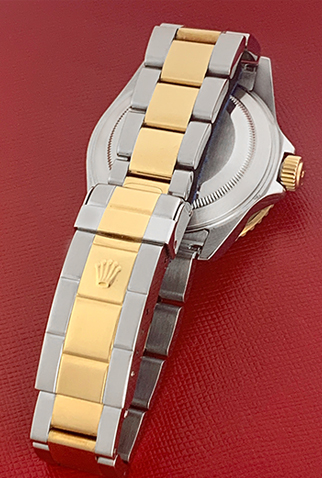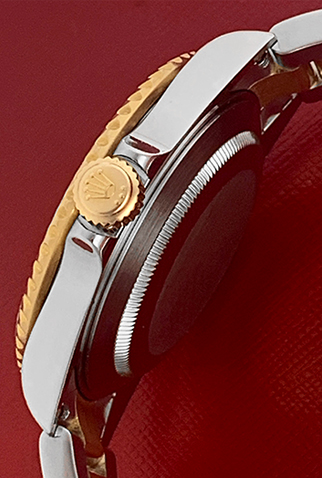 Case Material: Stainless Steel case with 18K Yellow Gold bezel with Blue insert (41mm dia.)
