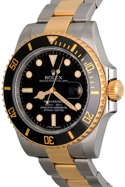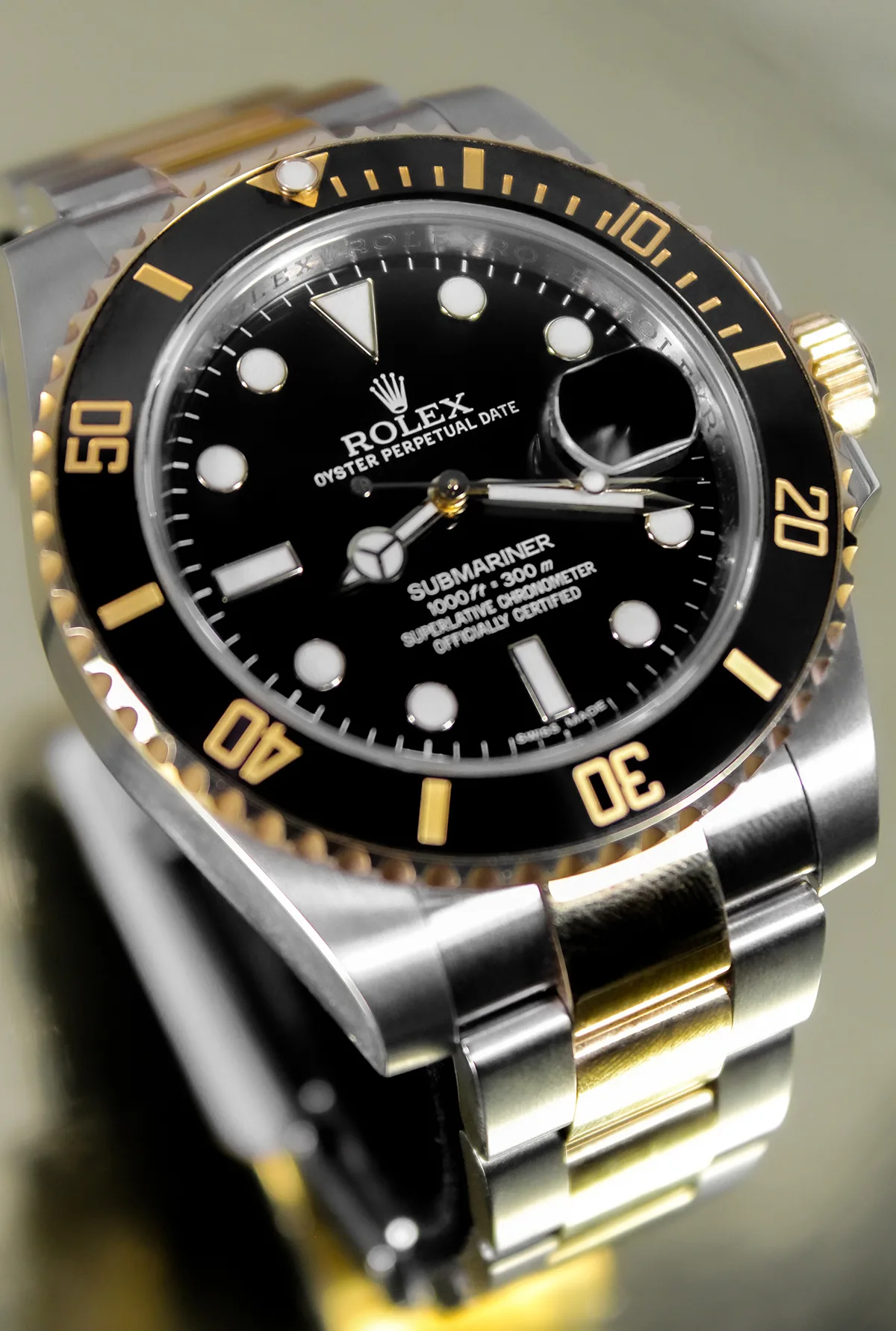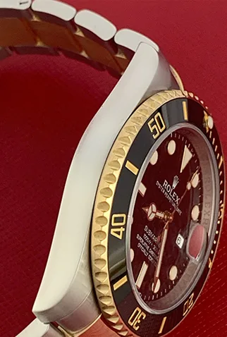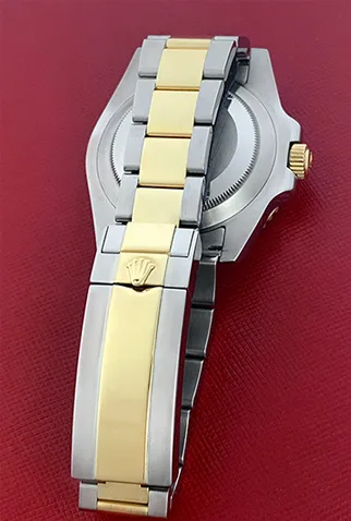 Case Material: Stainless Steel case with 18k Yellow Gold bezel with Black ceramic insert (40mm dia.)