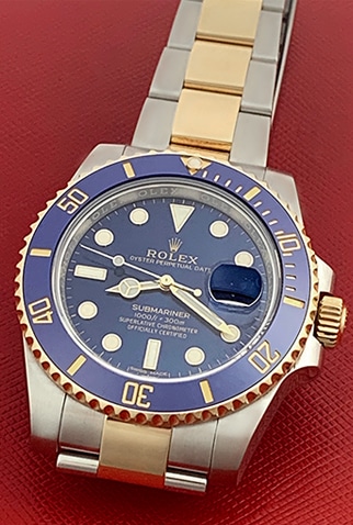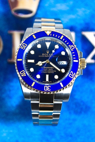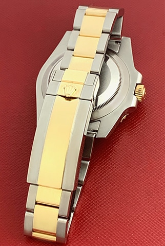 Case Material: Stainless Steel case with 18k Yellow Gold bezel with Blue ceramic insert (40mm dia.)