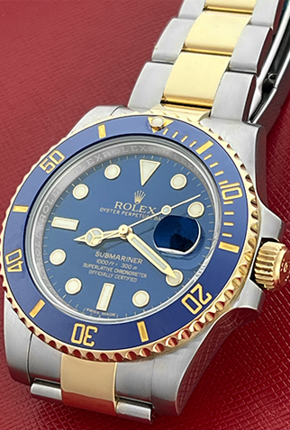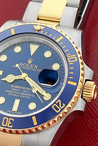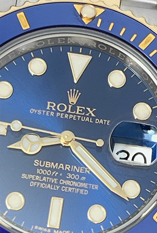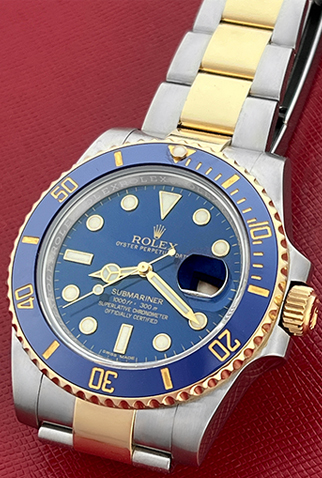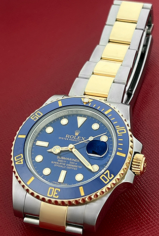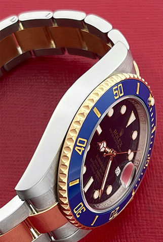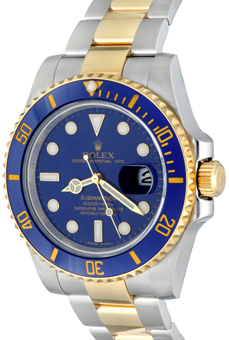 Case Material: Stainless Steel case with 18k Yellow Gold bezel with Blue ceramic insert (40mm dia.)