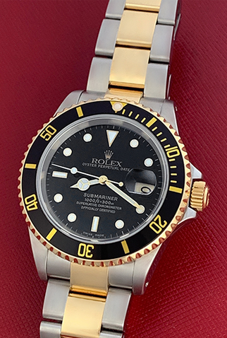 Case Material: Stainless Steel case with 18k Yellow Gold bezel with Black insert (40mm dia.)