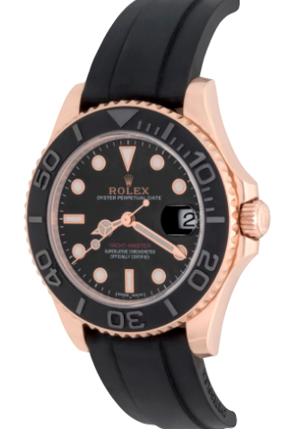 Strap: Black rubber Rolex strap with 18k Everose Rolex deployant flip-lock clasp
