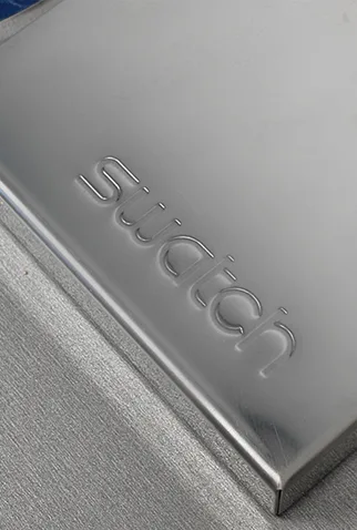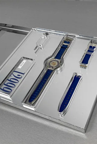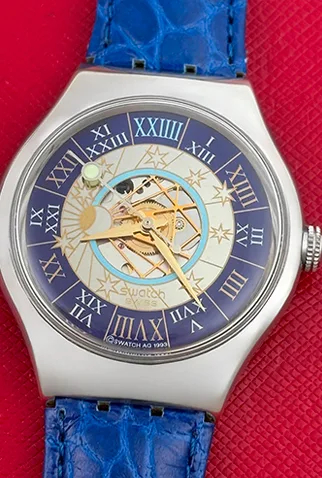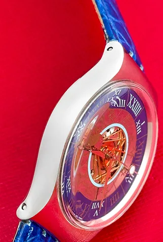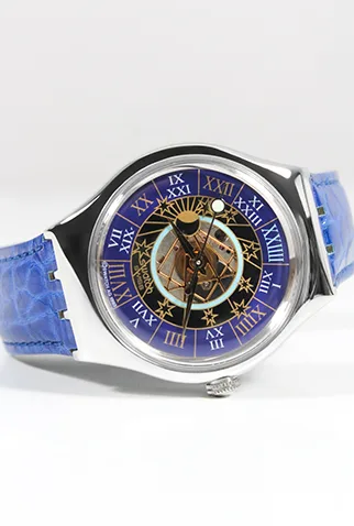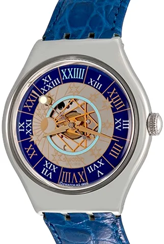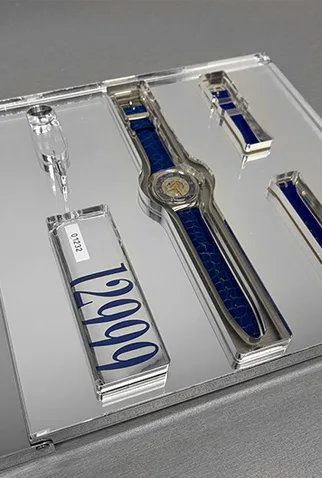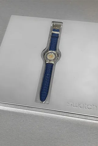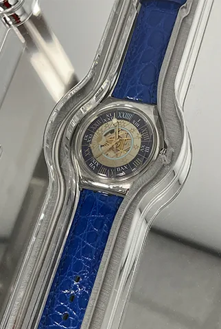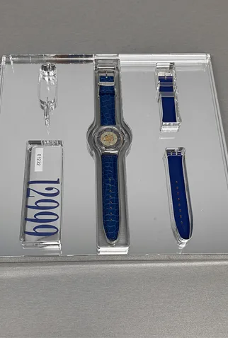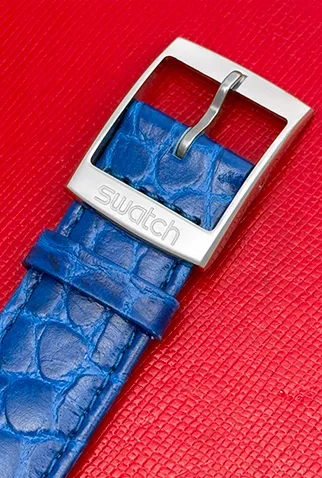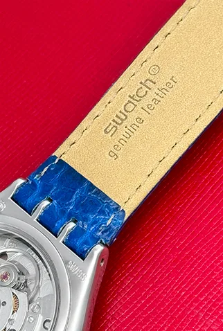 Strap: Blue alligator strap with Swatch Stainless Steel buckle. Note: extra blue plastic strap was included in special acrylic box