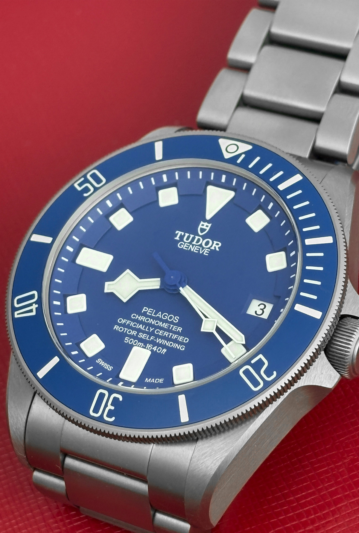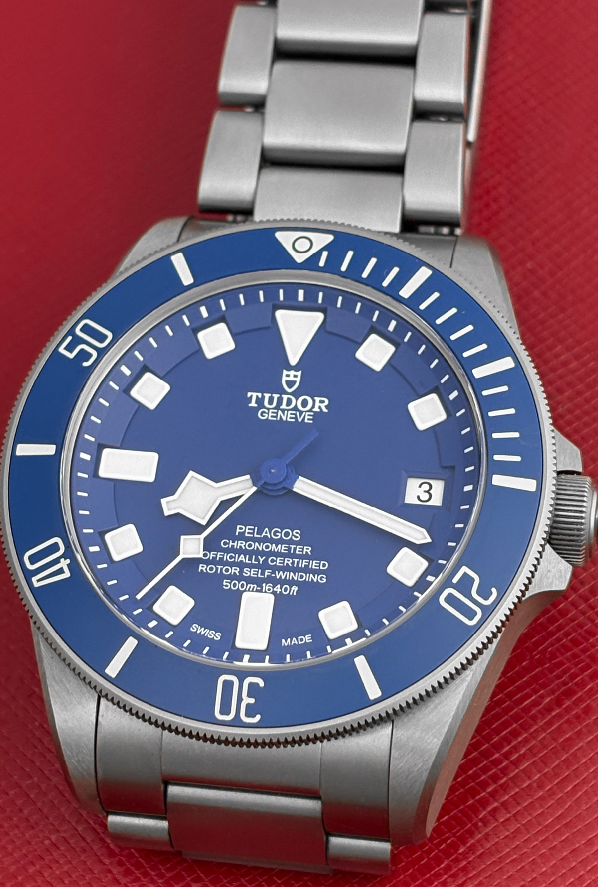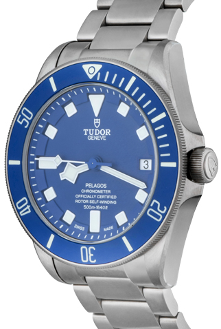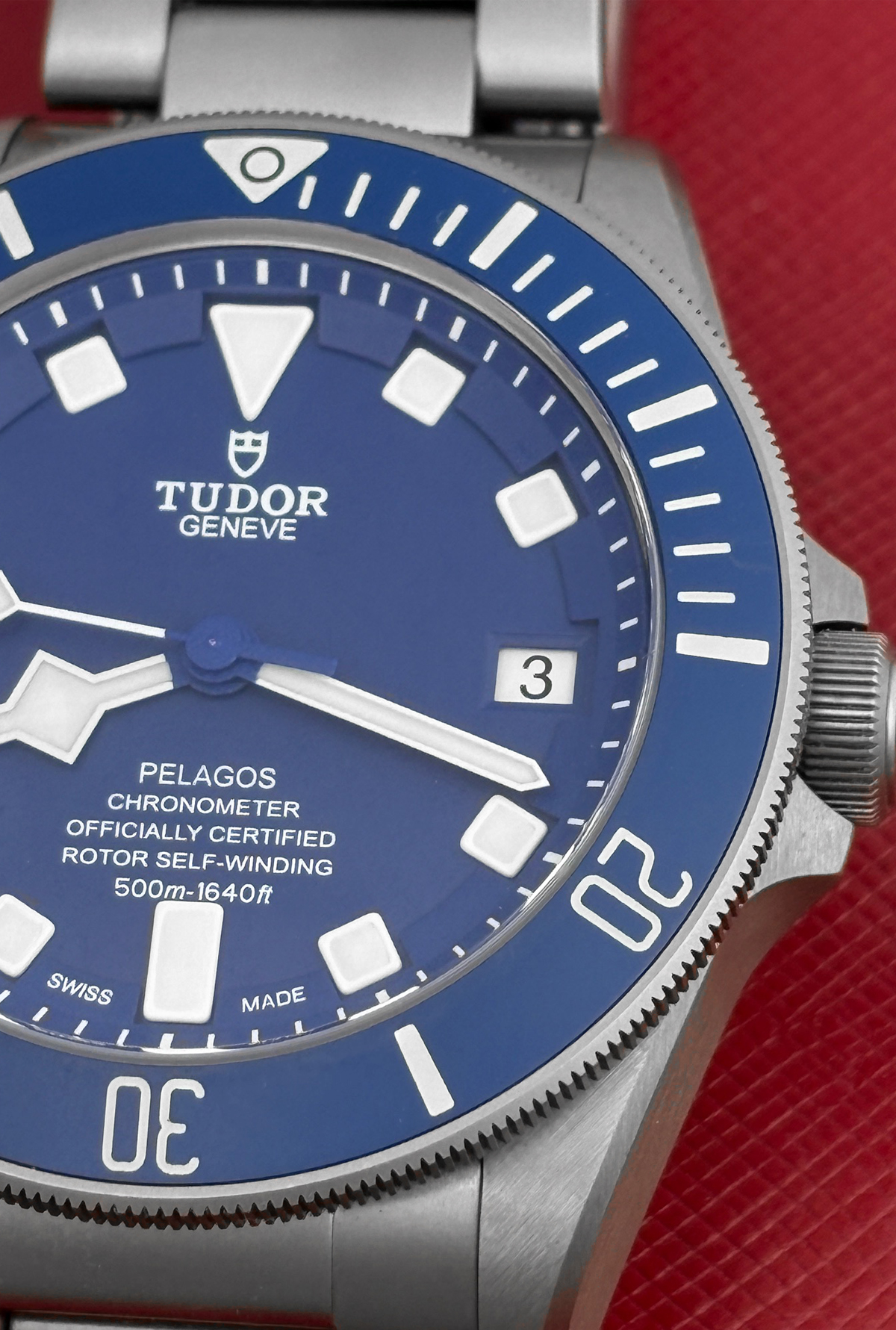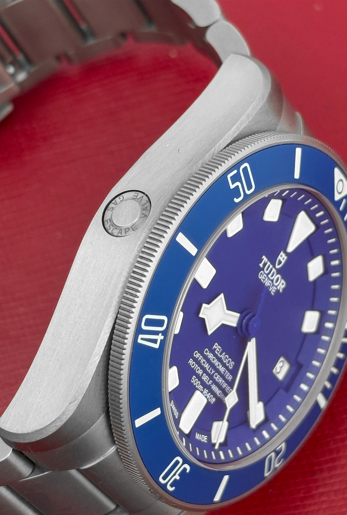 Case Material: Titanium case with rotating blue bezel (42mm dia.). Water Resistant to 500 Meters – 1640 Feet