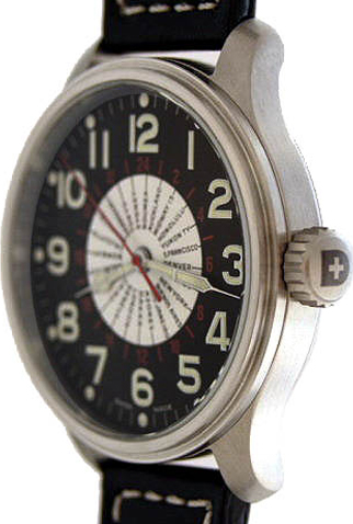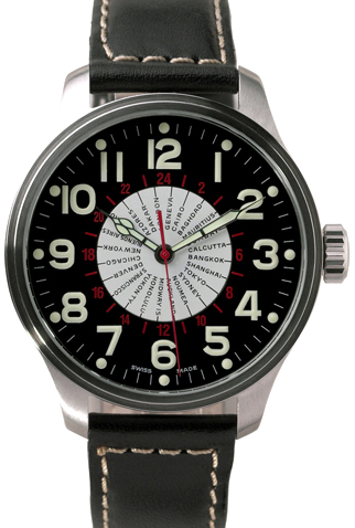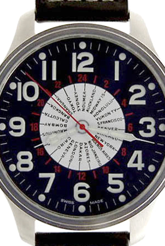 Dial: Black with luminous Arabic numerals with luminous hands. White inner Dial with 24 Cities.