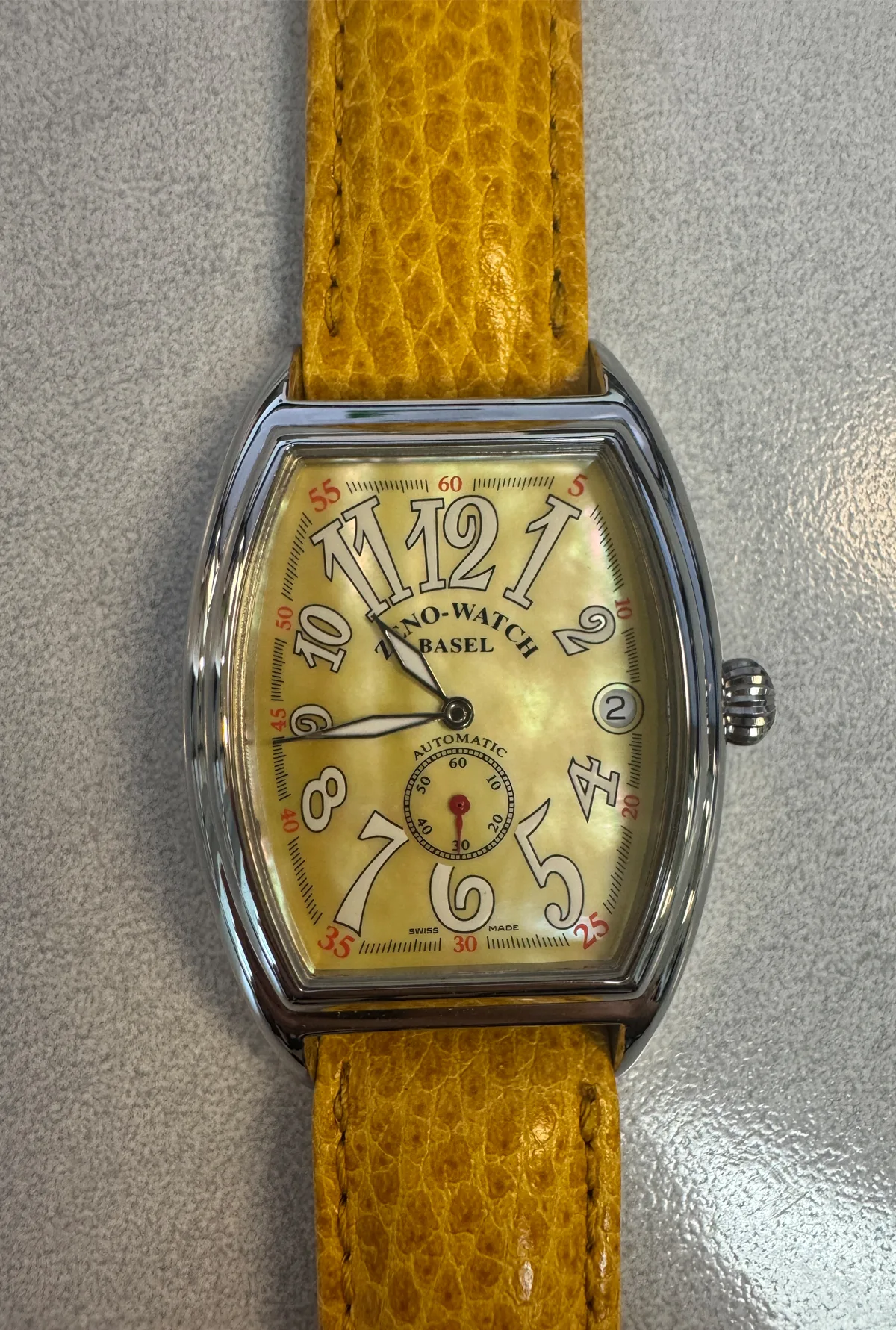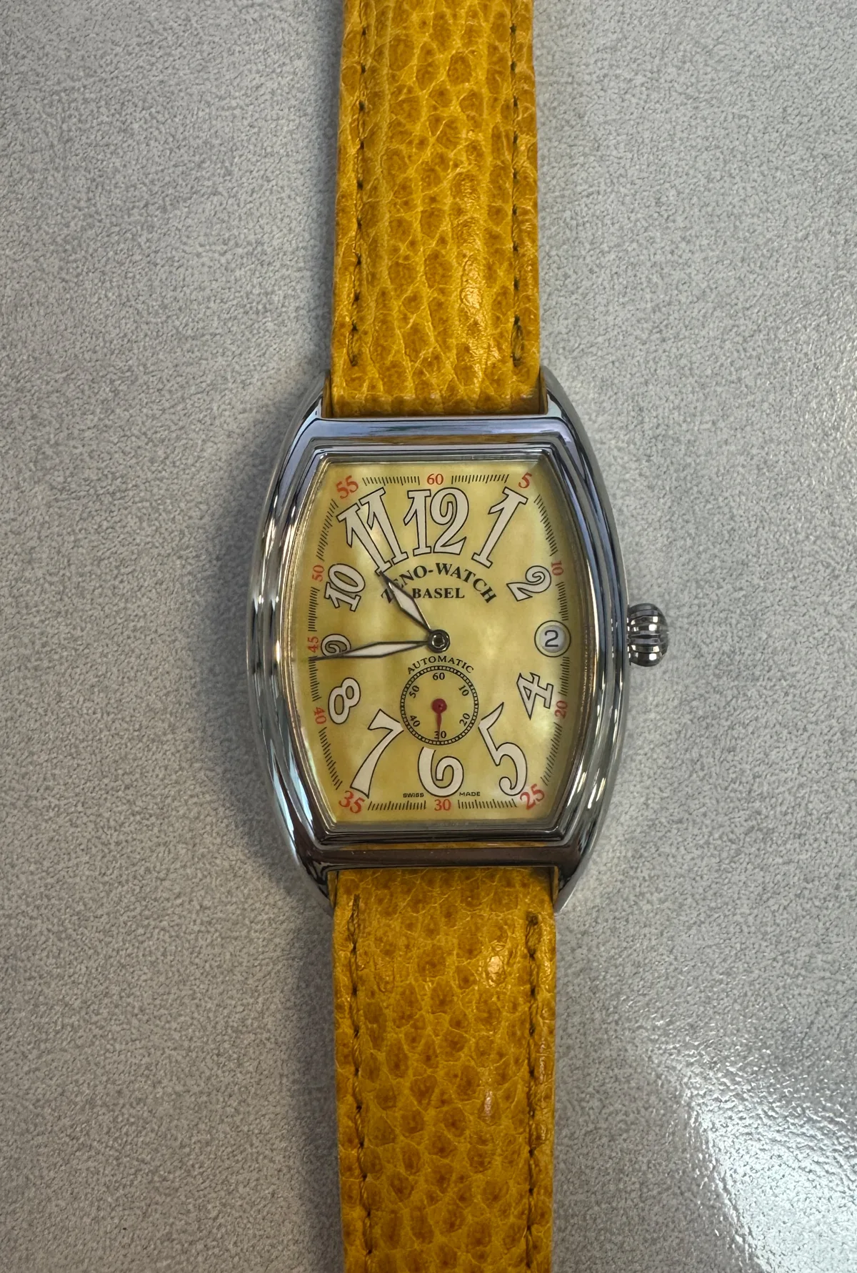Case Material: Polished Stainless Steel case with hardened mineral crystal and exposition back to view movement. Diameter 35mm. Length 41mm. Thickness 11mm. Water-resistant to 3ATM/100 Feet